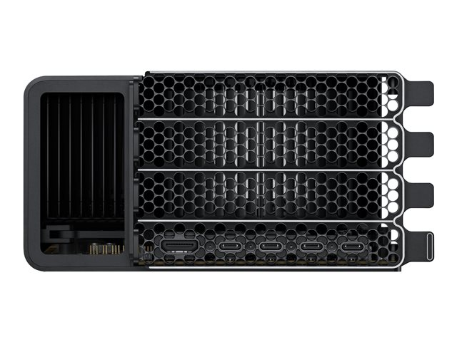 For grafikk i arbeidsstasjonklassen og krevende proffapper kan du velge Radeon Pro W6800X MPX-modulen med 32 GB GDDR6-minne som gir opptil 512 GBps minnebåndbredde. Du kan installere opptil to i Mac Pro med Infinity Fabric Link, slik at du får ytelsen fra to grafikkort til bruk i apper som Final Cut Pro. Dette grafikkalternativet har også databehandling på opptil 16 teraflops med enkel presisjon, eller 32 teraflops med halv presisjon. Den støtter opptil seks 4K-skjermer, tre 5K-skjermer eller tre Pro Display XDR-skjermer. Og MPX-modulen i full høyde fyller én MPX-skuff og bruker ekstra kraft og PCIe-båndbredde, slik at du får fire ekstra Thunderbolt 3-porter og én HDMI 2.0-port på kortet.