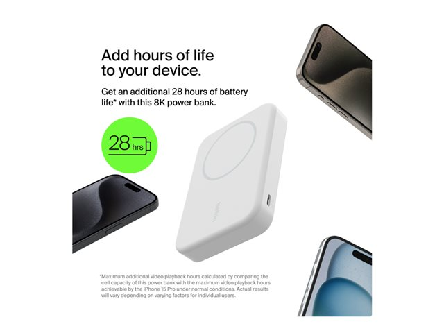 Belkin - Trådløs nødlader - magnetisk med Qi2 - 8000 mAh - 15 watt - Fast Charge (USB-C) - på kabel: USB-C - hvit