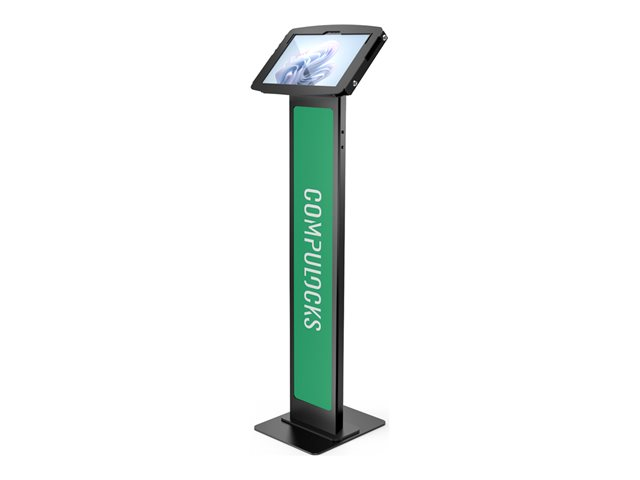 Our BrandMe floor stand allows you to utilize a panel for branding, call to action or custom design to bring attention to your interactive display or kiosk. The tilting mount allows the iPad enclosure to be set in either portrait or landscape mode and the stand base offers additional security features, securing the power source and bolting the unit to the floor.