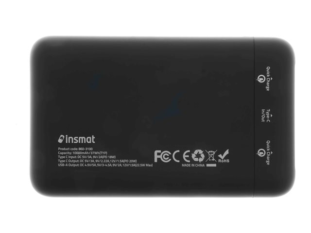 Insmat - Strømbank - 10000 mAh - 22.5 watt - 5 A - PD 3.0 - 3 utgangskontakter (USB, 24 pin USB-C)